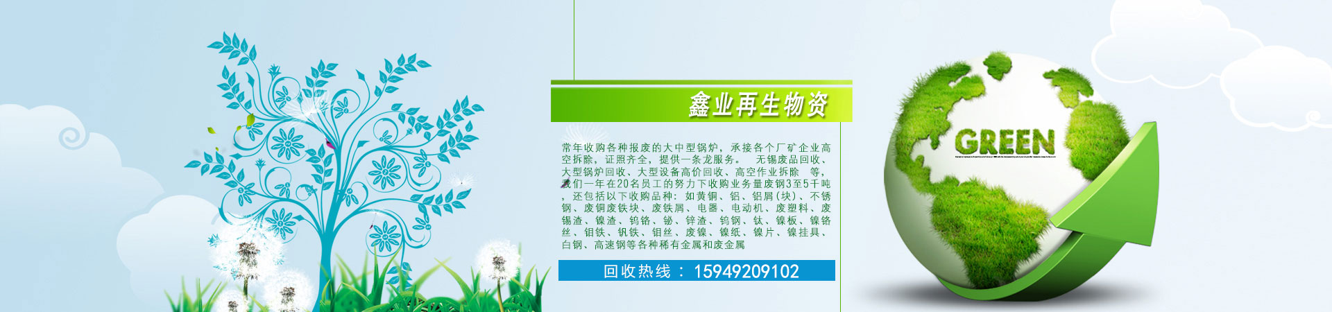 公司簡介無錫市鑫業再生物資利用有限公司常年收購各種報廢的大中型鍋爐,承接各個廠礦企業高空拆除,證照齊全,提供一條龍服務。 無錫廢品回收、大型鍋爐回收、大型設備高價回收、高空作業拆除 等,我們一年在20名員工的努力下收購業務量廢鋼3至5千噸,還包括以下收購品種:如黃銅、鋁、鋁屑(塊)、不銹鋼、廢銅廢鐵塊、廢鐵屑、電器、電動機、廢塑料、廢錫渣、鎳渣、鎢鉻、鉍、鋅渣、鎢鋼、鈦、鎳板、鎳鉻絲、鉬鐵、釩鐵、鉬絲、廢...了解更多>>